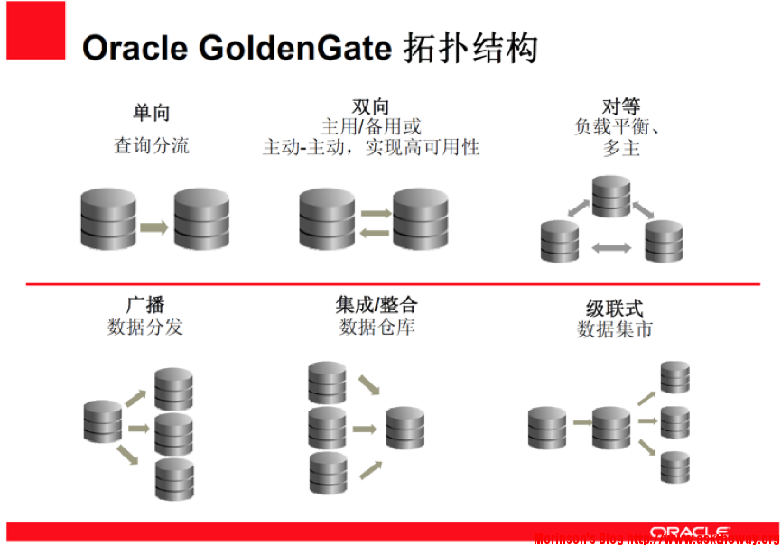 上图是goldengate的使用场景,第一种是用于容灾,可以从源库传输数据到目标库,而目标库用来做备份。第二种是用于升级迁移。第三种就是用于压力卸载,读写分离,比如报表库或者查询库的实现。第四种是像数据仓库一样对数据的提取和汇总。第五种就是数据分发。