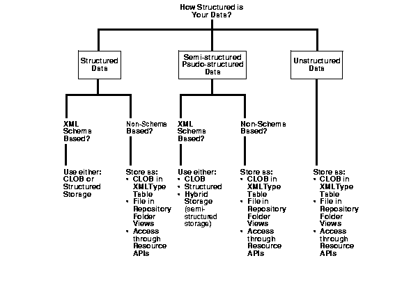 Will your data be highly structured (mostly XML), semi- structured (pseudo- structured), or mostly non-structured? If highly structured, will your table(s) be XML schema-based or non-schema-based? See "Oracle XML DB Application Design: a. How Structured Is Your Data?" and Chapter 3, "Using Oracle XML DB".