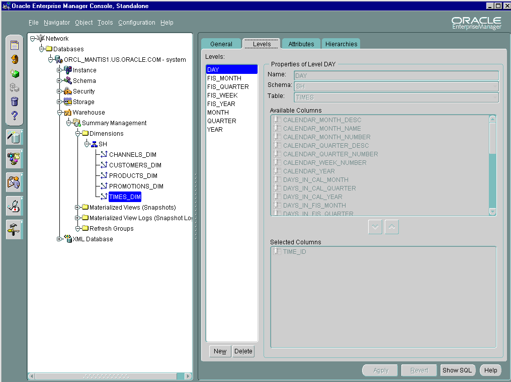 Oracle Enterprise Manager Administrator's Guide and "Using the Dimension Wizard" for details regarding creating and using dimensions |