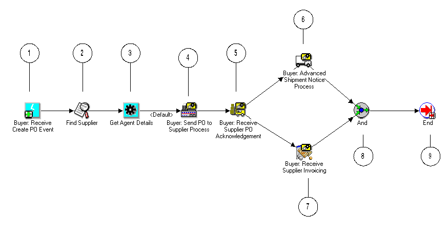 When you display the Process window for the Buyer: Top Level PO process, you see that the process consists of nine unique activities. To examine the activities of the process in more detail, we have numbered each node for easy referencing below. The numbers themselves are not part of the process diagram.