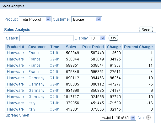 Figure 10-0 shows a report in PDF format based on the query shown in Example 10-1. When generating a report for distribution, you can select any combination of Products, Customers, and Time Periods from the choice lists. The selection for this report is Hardware products, customers in Europe, and months in Q2-01. This chapter explains how you can create a report like this one using drillable dimensions.