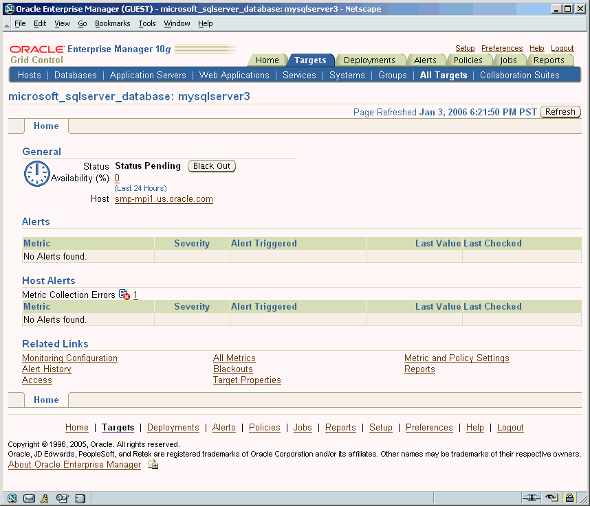 Each target instance added to Enterprise Manager is automatically provided with a comprehensive target type-specific home page. No coding is required. The default target home page provides a consolidated view of target availability and alerts. Links to related monitoring information such as Monitoring Configuration, Metric and Policy Settings, and Alert History are also included. Figure 1-1 shows the default target home page for a Microsoft SQL Server database.