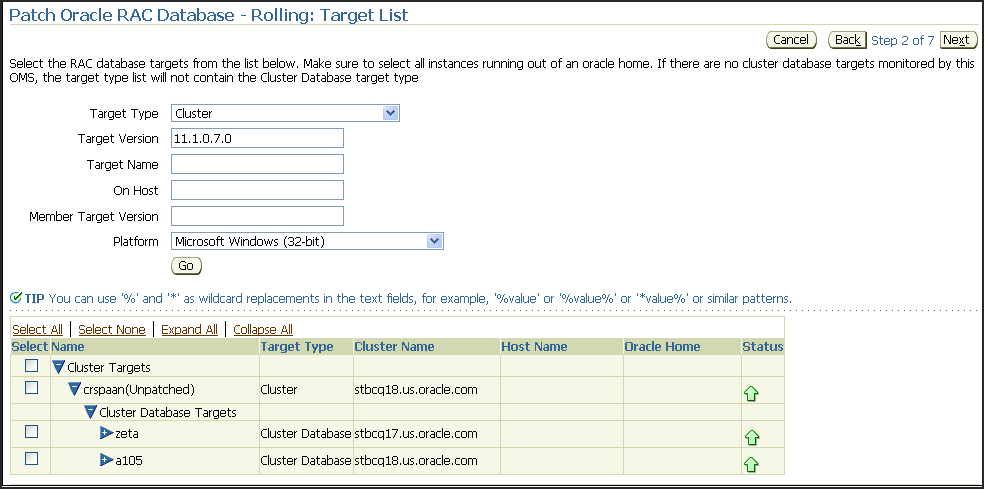 On the Target List page, in the RAC Database Targets to be Patched section, click Add to add the Oracle RAC database targets you want to patch. If you have multiple Oracle RAC databases in a cluster and if you are not sure of the selection, then search for all RAC databases in that cluster by selecting Cluster from the Target Type list. Then click Next.