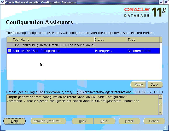 The configuration assistants will complete populating all the metadata related to the Oracle Application Management Pack for Oracle E-Business Suite to the Grid Control Repository and restart the Management Service. You can view the progress of the configuration assistants in this window.