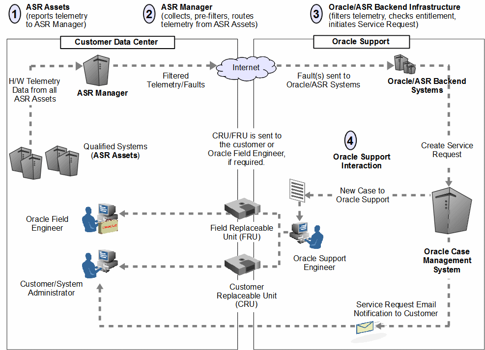 Oracle/ASR Backend Systems: The ASR backend infrastructure at Oracle collects all telemetry data forwarded to it from the ASR Manager, or ASR Managers if multiple instances are installed. The fault rule technology on these backend systems ascertain the reality of the fault telemetry, and forwards recognized faults to Oracle's Service Request system. From there, the following actions occur: