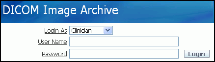 Before you can begin to work on any of the user tasks, you must log in to the DICOM Image Archive interface and identify your role as a clinician or researcher.