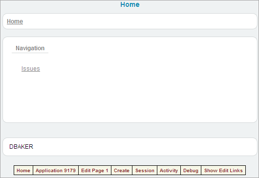 The Create Application Wizard creates the Home page, Issues report page, and Issue Details page. Because you are creating an interactive report, the wizard automatically includes a Search Bar, Actions Menu, Column Heading Menu, and a link from the Issues report page to the Issue Details form.