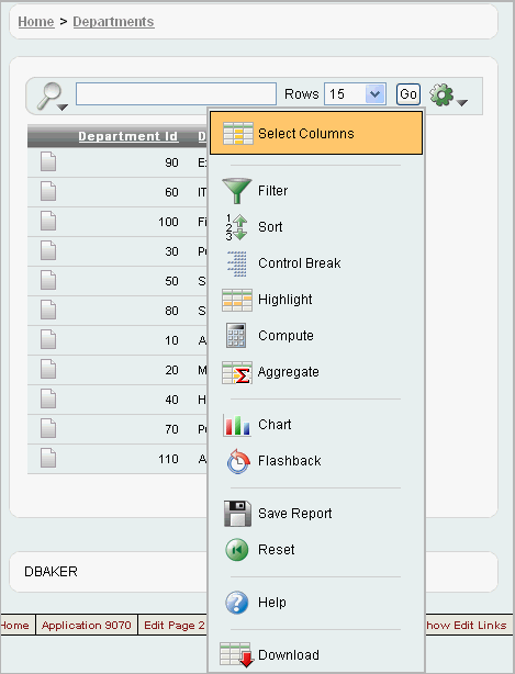 Also notice the Developer toolbar at the bottom of the page. These links appear when you run an application within the development environment. The Developer toolbar offers a quick way to edit the current page, create a page, region, or page control, view session state, or toggle in and out of Debug mode.