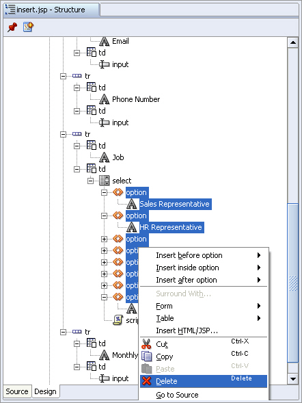 To create the drop down list displaying the list of job IDs and job titles in the Insert page, you hard-coded the job IDs and job titles. In the following steps, you replace this with a dynamically-generated list provided by the REF CURSOR created in the previous section.