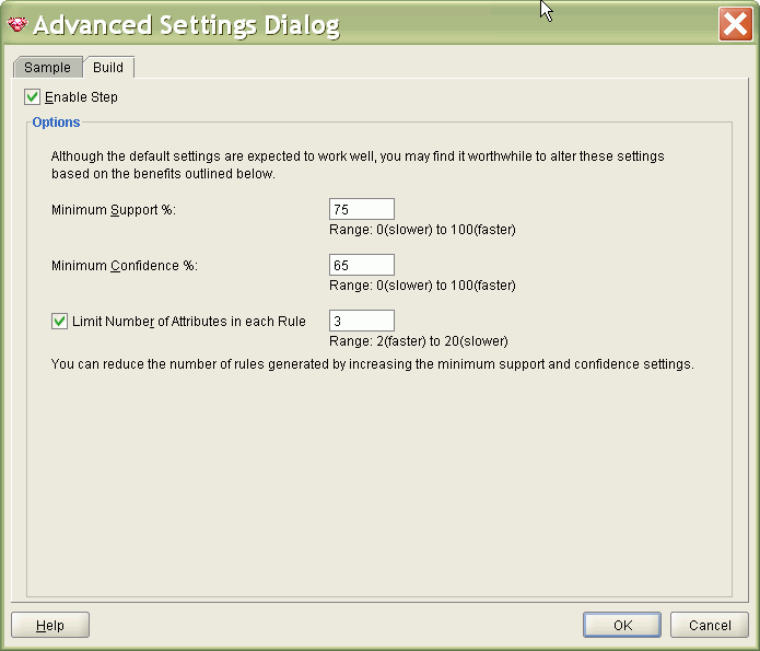 Oracle Database PL/SQL Packages and Types Reference for descriptions of the build settings for association rules