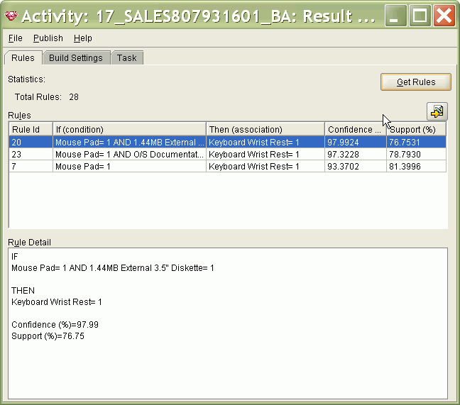 Figure 8-7 shows the three rules that result from the filtering criteria specified in Figure 8-6. The first rule states that a customer who purchases a mouse pad and a 1.44 MB External 3.5 Diskette is likely to also buy a keyboard wrist rest at same time. The confidence for this rule is 99%. The support is 77%.