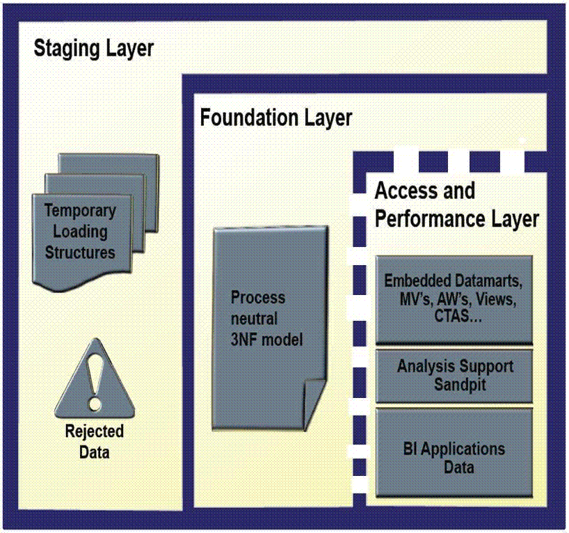 In some implementations this layer is not necessary, because all data transformation processing is done "on the fly" as data is extracted from the source system before it is inserted directly into the foundation layer.Foundation or integration layer. This layer is traditionally implemented as a Third Normal Form (3NF) schema. A 3NF schema is a neutral schema design independent of any application, and typically has a large number of tables. It preserves a detailed record of each transaction without any data redundancy and allows for rich encoding of attributes and all relationships between data elements. Users typically require a solid understanding of the data to navigate the more elaborate structure reliably. In this layer data begins to take shape and it is not uncommon to have some end-user application access data from this layer especially if they are time sensitive, as data becomes available here before it is transformed into the Access and Performance layer.
