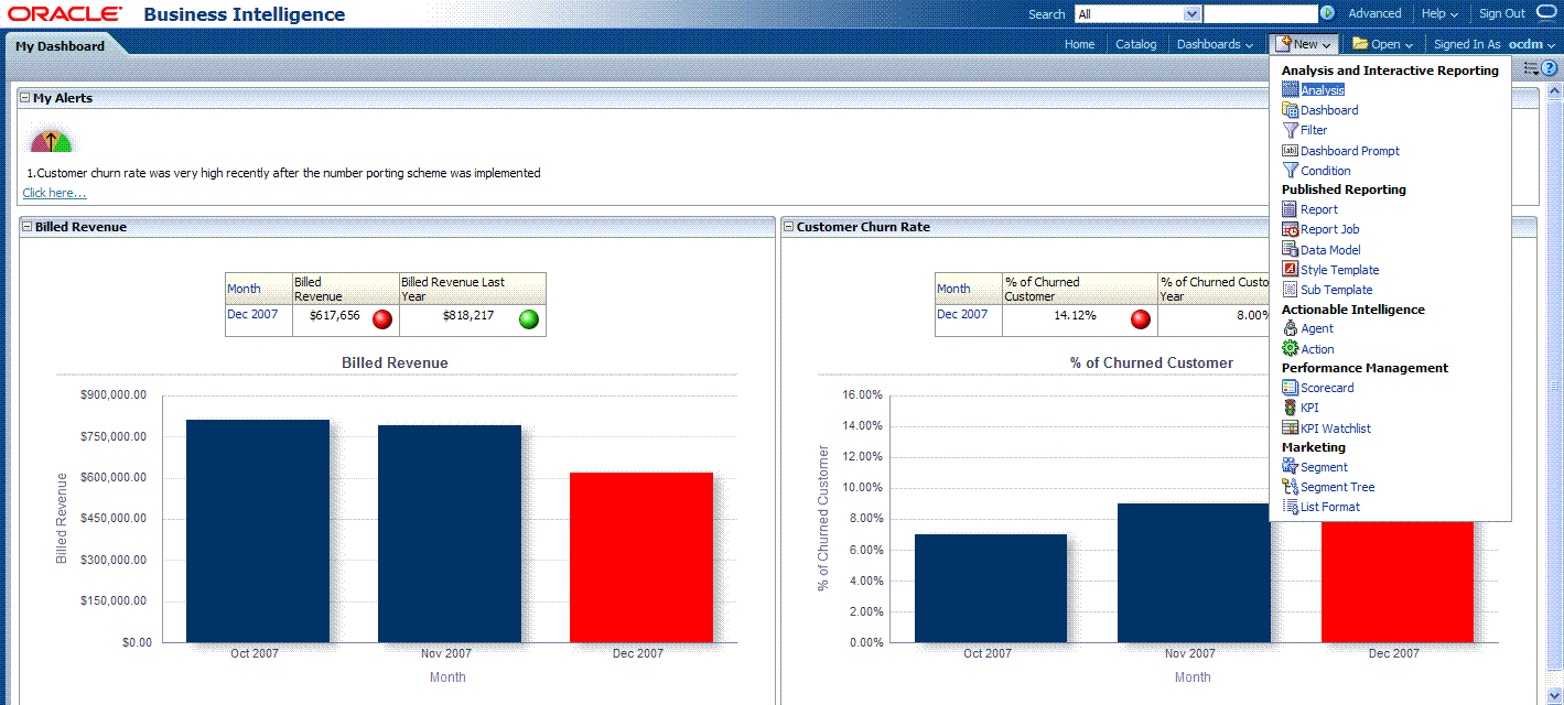 Oracle Communications Data Model Installation Guide for more information on installing the sample reports and deploying the Oracle Communications Data Model RPD and webcat on the Business Intelligence Suite Enterprise Edition instance.In this example assume that you want to create a dashboard named "Dropped call and Failed Call", and put both "Dropped Call Rate Report" and "Failed Call Rate Report" into this new dashboard.
