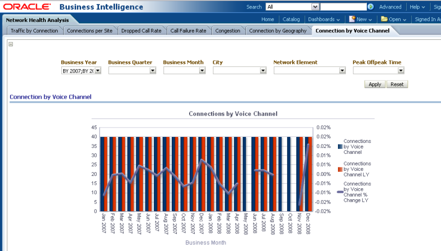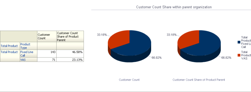 This report, as shown in Figure 12-22 provides year-level subscription performance based on churn statistics relating to a Customer, such as high churn rate analysis for a subscription, and so on. Oracle Communications Data Model provides certain operational measures such as forecasting, prediction, and so on, to over come this problem This data can be analyzed together with LY and YTD data.