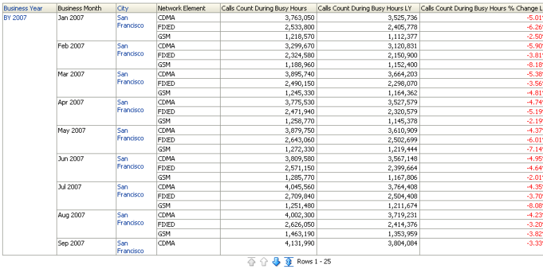 For the given customer, the report also displays the contract value, month revenue, debt value and so on. In fact, the end user can easily extend this report by adding any relational aggregated information about the customer into this report. For example, number of calls, number of complaints, and so on. They can use BIEE Answers to add those additional measures into the report.