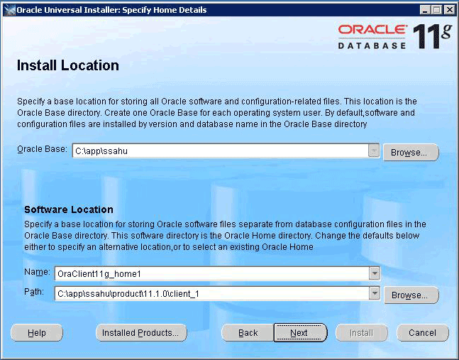 Figure 1-3 Oracle Universal Installer Install Location Screen