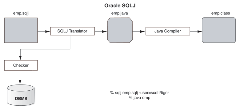 SQLJ consists of a translator and a run-time component and is smoothly integrated into your development environment. You can run the translator to translate, compile, and customize the code in a single step using the sqlj front-end utility. The translation process replaces embedded SQL statements with calls to the SQLJ run time, which processes the SQL statements. In ISO SQLJ standard this is typically, but not necessarily, performed through calls to a JDBC driver. To access Oracle Database, you would typically use an Oracle JDBC driver. When you run the SQLJ application, the run time is started to handle the SQL operations.