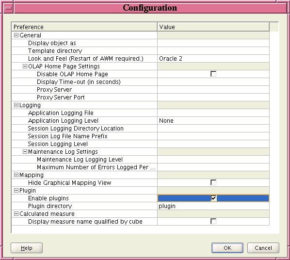 Figure 2-2 shows the Configuration dialog box with Enable plugins selected and with plugin as the value for Plugin directory. The value should include the full path to the plug-in directory unless the directory is a subdirectory of the Oracle_home/olap/awm directory, which is the case for the plugin directory shown in the figure.