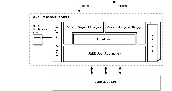 The GDK application framework for J2EE provides the globalization framework for building J2EE-based Internet application. The framework encapsulates the complexity of globalization programming, such as determining user locale, maintaining locale persistency, and processing locale information. It consists of a set of Java classes through which applications can gain access to the framework. These associated Java classes enable applications to code against the framework so that globalization behaviors can be extended declaratively.