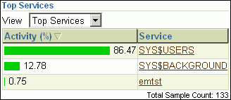 In the example shown in Figure 4-6, the SYS$USERS service is consuming 86.47% of database activity. This service corresponds to the database sessions for users hr and sh shown in Figure 4-5.