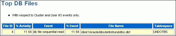 The Top DB Files subsection lists the database files that accounted for the highest percentages of sampled session activity. Only cluster and I/O events are considered. The % Event column breaks down the activity by event, so if multiple rows exist in this table, then the sampled activity is divided among multiple events.