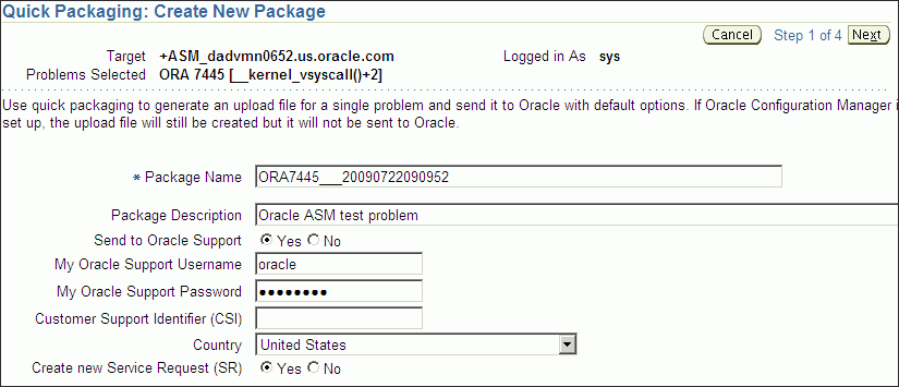Figure 9-18 Oracle Automatic Storage Management Support Workbench Create Package
