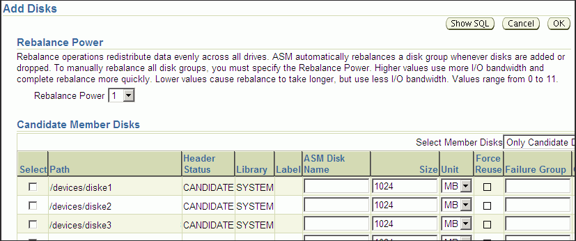 To display not only disks that are available to be added to a disk group, but all of the Oracle ASM disks, including disks that belong to a disk group (header status = MEMBER), select All Disks from the Select Member Disks drop-down list on the right hand side of the page. Oracle Enterprise Manager re-displays the page with the complete list of Oracle ASM disks that were discovered by the Oracle ASM instance.