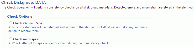 Select Check Without Repair to record information about disk group inconsistencies in the alert log. In this operation, Oracle ASM does not resolve the errors. Select Check And Repair to attempt to repair errors that Oracle Enterprise Manager identifies during the disk group consistency check.