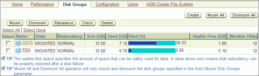 Click the Disk Groups link at the top of the page to view the Disk Groups page. Oracle Enterprise Manager displays a page similar to the one shown in Figure 9-6.