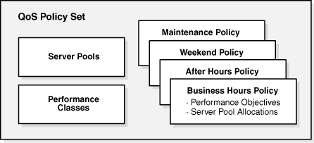 "Managing Performance Classes"To manage the various Performance Objectives, you define one or more Performance Policies. A Performance Policy is a collection of Performance Objectives and a measure of how critical they are to your business. For example, you might define a Performance Policy for normal business hours, another for weekday nonbusiness hours, one for weekend operations, and another to be used during processing for the quarter-end financial closing. At any given time, a single Performance Policy is in effect as specified by the Oracle Database QoS Management administrator. Within each Performance Policy, the criticalness, or ranking, of the Performance Objectives can be different, enabling you to give more priority to certain workloads during specific time periods.