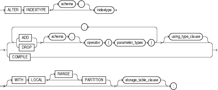 This clause has the same behavior when altering an indextype that it has when you create an indextype. Refer to the CREATE INDEXTYPE clause WITH LOCAL PARTITION for more information.