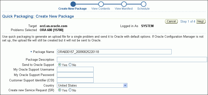 For this task, you use the quick packaging process of the Support Workbench to package and upload the diagnostic information for the problem to Oracle Support. Quick packaging has a minimum of steps, organized in a guided workflow (a wizard). The wizard assists you with creating an incident package (package) for a single problem, creating a zip file from the package, and uploading the file. With quick packaging, you are not able to edit or otherwise customize the diagnostic information that is uploaded. However, quick packaging is the more direct, straightforward method to package and upload diagnostic data.