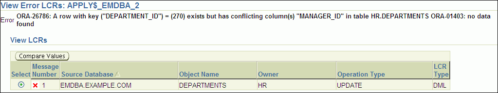 To drill down further, select a row change and click Compare Values. The Compare Values page appears and compares the row change with the data in the table to which the change should be applied.