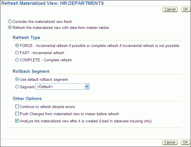 Click Go to open the Refresh Materialized View page for the selected materialized view.