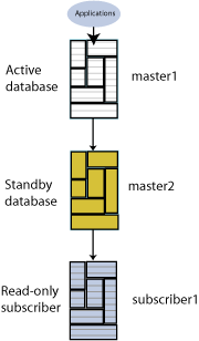 This section describes how to create an active standby pair with one subscriber. The active database is master1. The standby database is master2. The subscriber database is subscriber1. To keep the example simple, all databases reside on the same computer, server1.