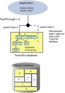 PassThrough=0 is the default setting and specifies that all statements are to be executed in the TimesTen database. Figure 5-1 shows that Table A is updated on the TimesTen database. Table F cannot be updated because it does not exist in TimesTen.