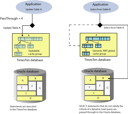 Figure 5-4 shows that Table A is updated on the Oracle database for a read-only or updatable cache group. A SELECT statement that references Table G is also passed through to the Oracle database. A SELECT statement that references Table C in a dynamic AWT global cache group is passed through to the Oracle database.