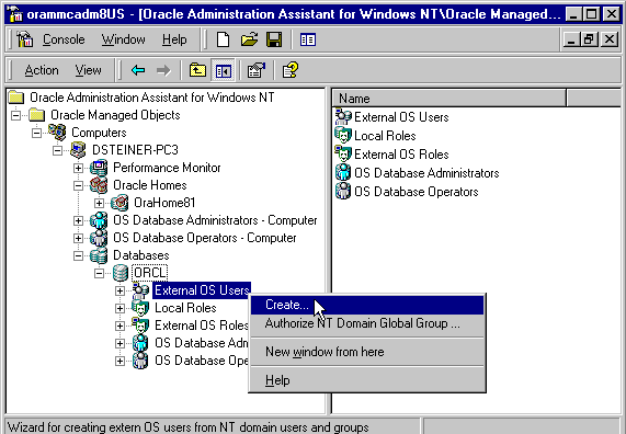 In addition, Oracle Administration Assistant for Windows can create and grant local and external database roles to Windows domain users and global groups.