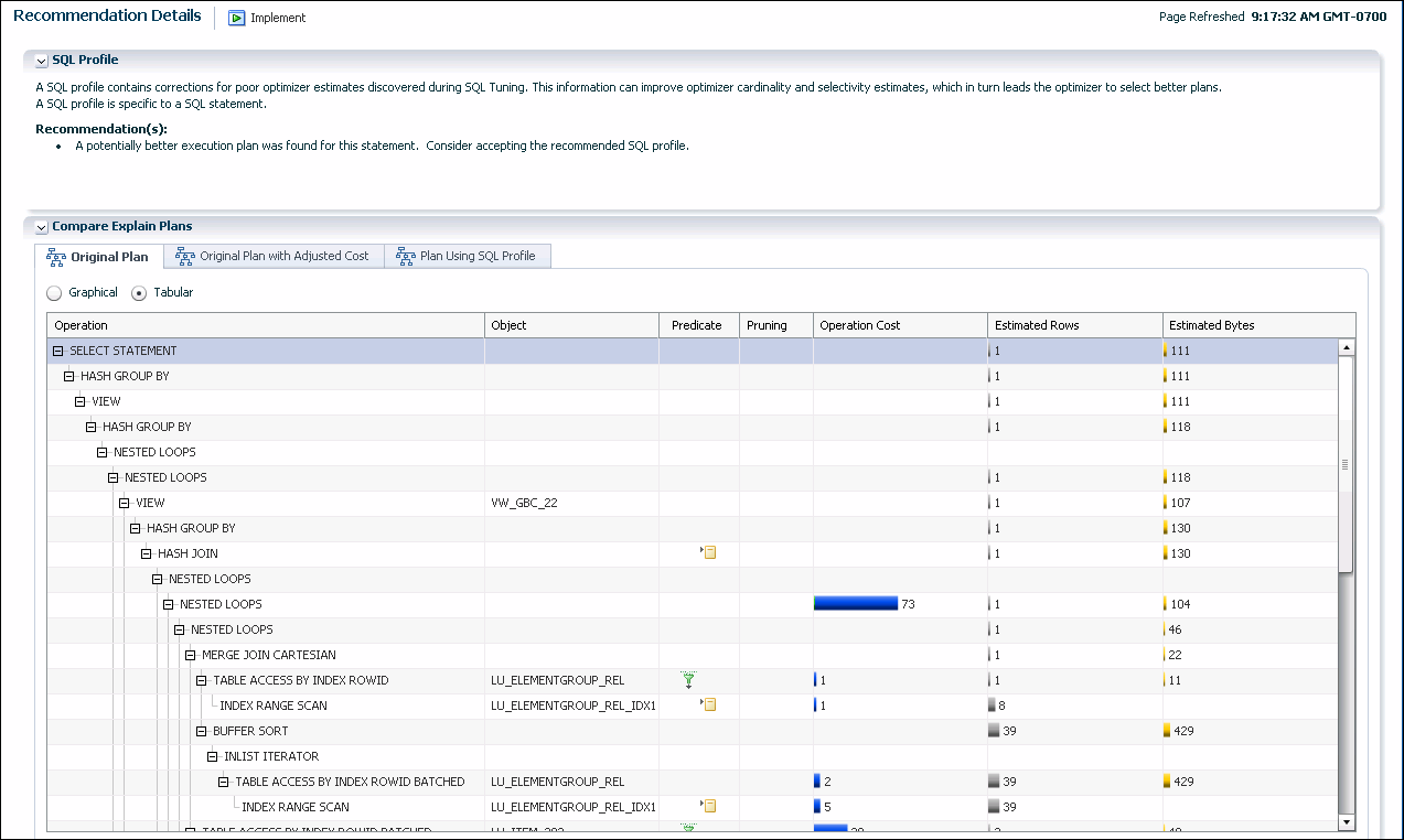 The Compare Explain Plans section at the bottom of the page includes tabs that that enable you to view one or more execution plans for the selected statement. The four tabs that can appear are the Original Plan, Original Plan with Adjusted Cost, Plan Using SQL Profile, and Alternative Plan tabs. The Graphical and Tabular buttons enable you to display an execution plan in graphical or tabular format. In this example, the execution plan is displayed in tabular format.
