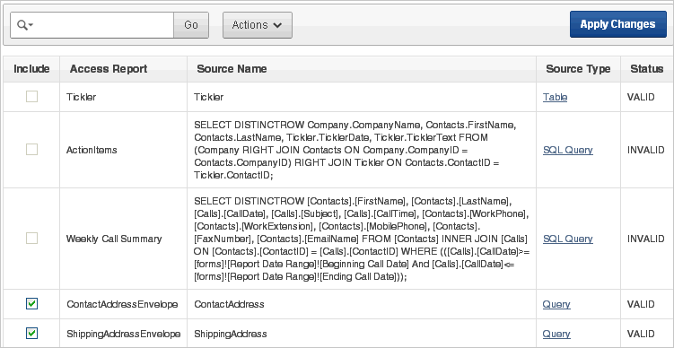 Next, review the reports retrieved from the Microsoft Access export. Application Migration identifies invalid reports and lists additional information, such as the report's source type and source name.
