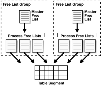 As shown in Figure 12-4, you can also create an object with one or more free list groups, which are collections of free lists. Each group has a master free list that manages the individual process free list in the group. Space overhead for free lists, especially for free list groups, can be significant.