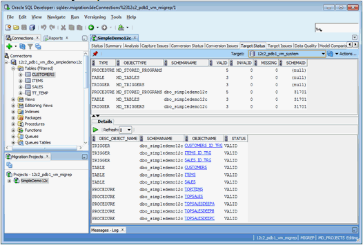The Target Status report provides information about the status of the migrated objects in the Target database. First, select a target connection with enough privileges to view the status of other schema objects and then select refresh. Objects that are present in the converted model, but are missing from the target Oracle Database, are listed as missing. These objects can be either valid or invalid.