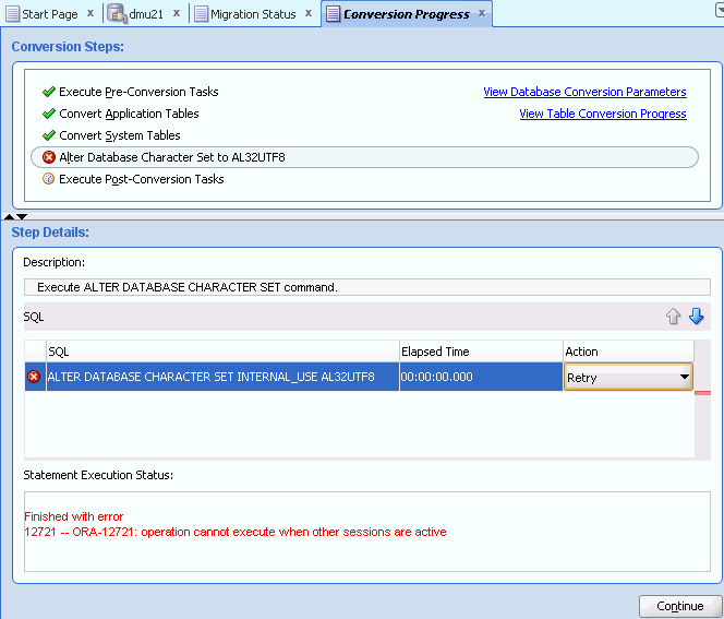 If you click the failing statement, the reported database error messages are displayed in the Statement Execution Status field. You can tell the DMU to retry or skip the statement by selecting the corresponding option from the drop-down list in the Action column of the SQL Statement area. Use the Skip option very cautiously because leaving a statement out of the conversion process could leave the database in an inconsistent state. After you select how to proceed with the failing statement, click Continue to resume the conversion process.