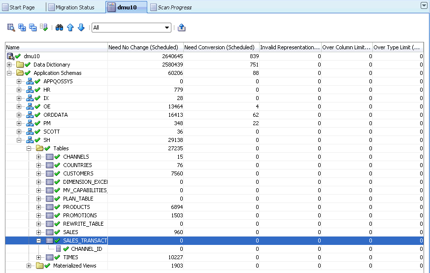 If the scan result shows only columns with data not requiring conversion, the contents of the database are correct and this part of the validation process is finished.