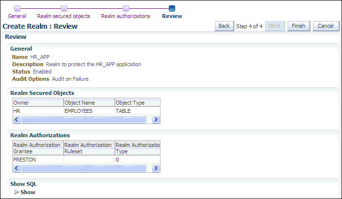 After you create a realm, you can register a set of schema objects or roles (secured objects) for realm protection and authorize a set of users or roles to access the secured objects.
