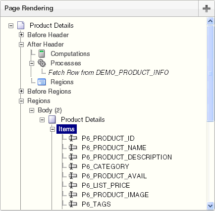 "Understanding Application-Level Items"You create and edit page-level items on the Page Definition. In both Component and Tree view, items display in the Page Rendering section. See "Switching Between Tree and Component View".