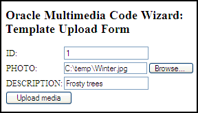 Enter the value 1 in the ID field on the Oracle Multimedia Code Wizard: Template Upload Form window. Click Browse... to find and select the image you want to upload in the PHOTO field, and enter a brief description of the image to be uploaded in the DESCRIPTION field, as shown in Figure 4-12. Then, click Upload media.