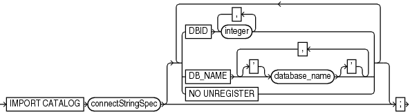 Use the IMPORT CATALOG command to import the metadata from one recovery catalog schema into a different catalog schema. If you created catalog schemas of different versions to store metadata for multiple target databases, then this command enables you to maintain a single catalog schema for all databases.