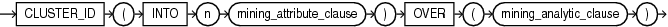 Analytic Syntax — Use the analytic syntax to score the data without a pre-defined model. Include INTO n, where n is the number of clusters to compute, and mining_analytic_clause, which specifies if the data should be partitioned for multiple model builds. The mining_analytic_clause supports a query_partition_clause and an order_by_clause. (See "analytic_clause::=".)