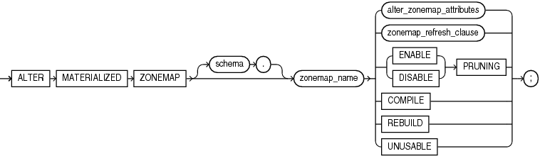 TheALTER MATERIALIZED ZONEMAP statement is available starting with Oracle Database 12c Release 1 (12.1.0.2).Use the ALTER MATERIALIZED ZONEMAP statement to modify an existing zone map in one of the following ways: